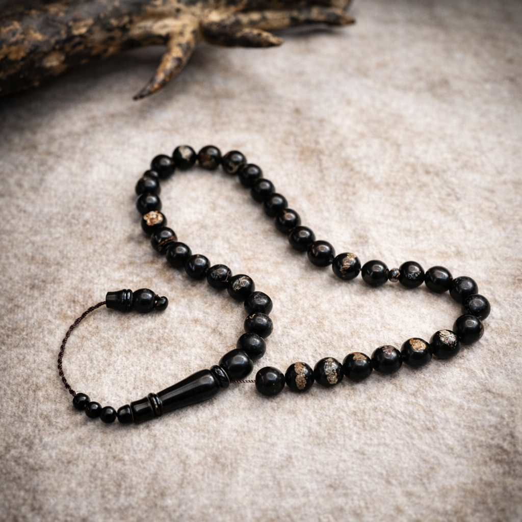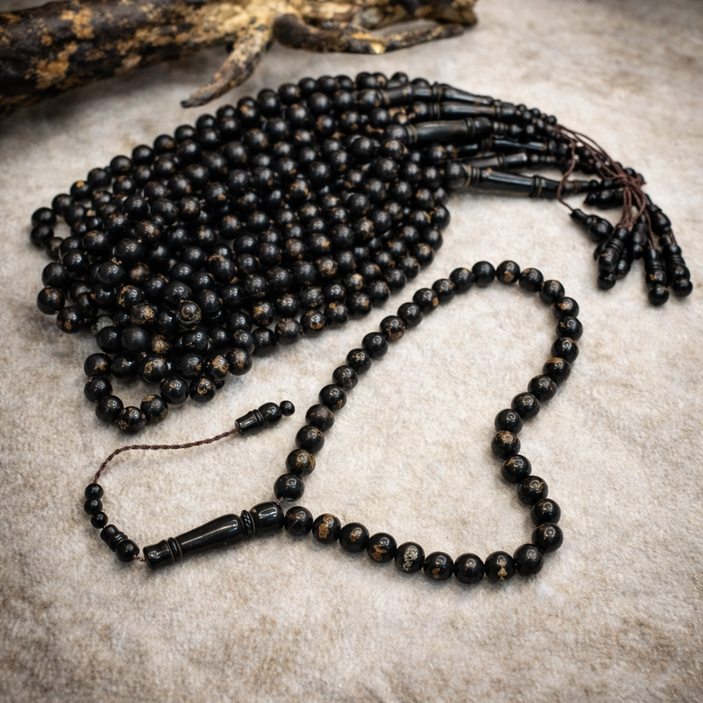 _ سبح فاخرة مشغولة بحرفية “التكتيل التركي” الشهيرة، تتميز بعروقها الذهبية الطبيعية وجاذبيتها العالية في السوق.